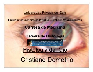 - 1. Universidad Privada del Este Faculdad de Ciencias de la Salud – Prof. Dr. Manuel Riveros Carrera de Medicina Cátedra de Histologia Histologia del Ojo Cristiane Demetrio