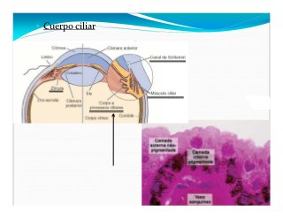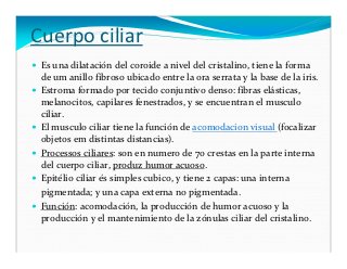 - 13. Cuerpo ciliar Es una dilatación del coroide a nivel del cristalino, tiene la forma de um anillo fibroso ubicado entre la ora serrata y la base de la iris. Estroma formado por tecido conjuntivo denso: fibras elásticas, melanocitos, capilares fenestrados, y se encuentran el musculo ciliar. El musculo ciliar tiene la función de acomodacion visual (focalizar objetos em distintas distancias). Processos ciliares: son en numero de 70 crestas en la parte interna del cuerpo ciliar, produz humor acuoso. Epitélio ciliar és simples cubico, y tiene 2 capas: una interna pigmentada; y una capa externa no pigmentada. Función: acomodación, la producción de humor acuoso y la producción y el mantenimiento de la zónulas ciliar del cristalino.