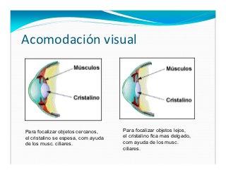 - 15. Acomodación visual Para focalizar objetos cercanos, Para focalizar objetos lejos, el cristalino se espesa, com ayuda el cristalino fica mas delgado, de los musc. ciliares. com ayuda de los musc. ciliares.