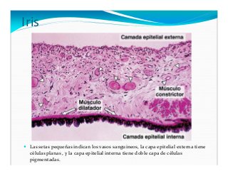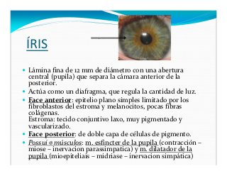 - 18. ÍRIS Lámina fina de 12 mm de diámetro con una abertura central (pupila) que separa la cámara anterior de la posterior. Actúa como un diafragma, que regula la cantidad de luz. Face anterior: epitelio plano simples limitado por los fibroblastos del estroma y melanocitos, pocas fibras colágenas. Estroma: tecido conjuntivo laxo, muy pigmentado y vascularizado. Face posterior: de doble capa de células de pigmento. Possui 2 músculos: m. esfincter de la pupila (contracción – miose – inervacion parassimpatica) y m. dilatador de la pupila (mioepiteliais – midriase – inervacion simpática)