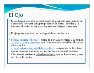 - 2. El Ojo El ojo humano es una estructura de alta complejidad, sensibles, capaces de detectar con gran precisión la forma, el color y la intensidad de la luz reflejada de muchos objetos diferentes. El ojo posse tres túnicas de disposición concéntrica: 1) capa exterior (fibroso) - formado por la esclerótica y la córnea. 2) úvea o túnica vascular - que comprende la coroides, el cuerpo ciliar y el iris. 3) capa interna nerviosa(fotosensible) - compuesta de la retina, que se comunica a través del nervio óptico hasta el cerebro. Obs: tiene tambien el cristalino o lente, que és biconvexo, y esta detrás de la pupila.