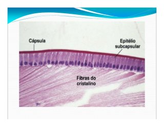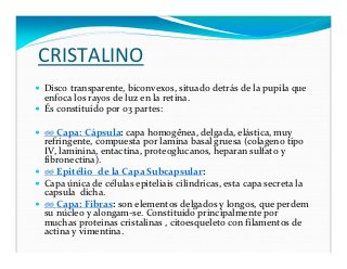 - 20. CRISTALINO Disco transparente, biconvexos, situado detrás de la pupila que enfoca los rayos de luz en la retina. És constituído por 03 partes: º¥ Capa: Cápsula: capa homogênea, delgada, elástica, muy refringente, compuesta por lamina basal gruesa (colageno tipo IV, laminina, entactina, proteoglucanos, heparan sulfato y fibronectina). №¥ Epitélio de la Capa Subcapsular: Capa única de células epiteliais cilindricas, esta capa secreta la capsula dicha. # Capa: Fibras: son elementos delgados y longos, que perdem su núcleo y alongam-se. Constituido principalmente por muchas proteinas cristalinas , citoesqueleto con filamentos de actina y vimentina.
