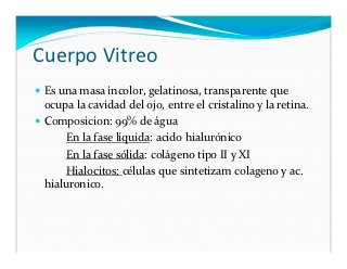 - 22. Cuerpo Vitreo Es una masa incolor, gelatinosa, transparente que ocupa la cavidad del ojo, entre el cristalino y la retina. Composicion: 99% de água En la fase liquida: acido hialurónico En la fase sólida: colágeno tipo II y XI Hialocitos: células que sintetizam colageno y ac. hialuronico.