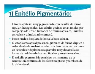 - 25. 1) Epitélio Pigmentário: Lámina epitelial muy pigmentada; con células de forma regular, hexagonales. Las células vecinas estan unidas por complejos de unión (uniones de fisuras apicales, uniones estrechas y zónulas adherentes.). Posse nucleo desplazado hacia la base celular. El citoplasma apical presenta: grânulos de forma eliptica o redondeada de melanina y detritus laminares de bastones, un reticulo endoplasmico agranular muy desarrollado – forma de red de tubulos ramificados y anastomosados. El epitélio pigmentário participa activamente de la renovacíon continua de los fotorreceptores y tambien de lo ciclo visual.