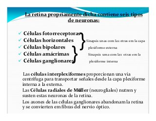 - 26. La retina propriamente dicha contiene seis tipos de neuronas: Células fotorreceptoras Células horizontales Células bipolares } Sinapsis unas com las otras em la capa } plexiforme externa Células amácrimas Sinapsis uma com las otras em la Células ganglionares plexiforme interna Las células interplexiformes proporcionan una via centrífuga para transportar señales desde la capa plexiforme interna a la externa. Las Células radiales de Müller (neurogliales) nutren y susten estas neuronas de la retina. Los axones de las células ganglionares abandonam la retina y se convierten em fibras del nervio óptico.