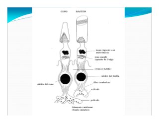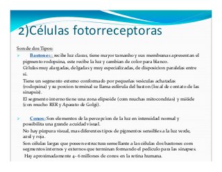 - 27. 2)Células fotorreceptoras Son de dos Tipos: Bastones : recibe luz claras, tiene mayor tamanho y sus membranas apresentan el pigmento rodopsina, este recibe la luz y cambian de color para blanco. Células muy alargadas, delgadas y muy especializadas, de disposicíon paralelas entre si. Tiene un segmento externo conformado por pequeñas vesículas achatadas (rodopsina) y su porcion terminal se llama esférula del baston (local de contato de las sinapsis). El segmento interno tiene una zona elipsoide (com muchas mitocondrias) y mióide (con mucho RER y Aparato de Golgi). Conos: Son elementos de la percepcíon de la luz en intensidad normal y possibilita una grande acuidad visual. No hay púrpura visual, mas diferentes tipos de pigmentos sensibles a la luz verde, azul y roja. Son células largas que poseen estructura semellante a las células dos bastones com segmentos internos y externos que terminan formando el pediculo para las sinapses. Hay aproximadamente 4- 6 millones de conos en la retina humana.