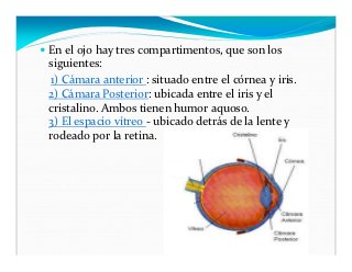 - 4. En el ojo hay tres compartimentos, que son los siguientes: 1) Cámara anterior : situado entre el córnea y iris. 2) Cámara Posterior: ubicada entre el iris y el cristalino. Ambos tienen humor aquoso. 3) El espacio vítreo - ubicado detrás de la lente y rodeado por la retina.
