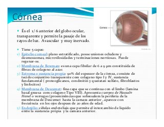 - 6. Córnea És el 1/ 6 anterior del globo ocular, transparente y permite la pasaje de los rayos de luz. Avascular y muy inervado. Tiene 5 capas: 1) Epitelio corneal: plano estratificado, posse uniones ocludens y desmossomas, microvilosidades y terminaciones nerviosas. Puede regenar-se. 2) Membrana de Bowman: es una capa fibrilar de 6 a 9 µm constituida de fibras de colageno al azar. 3) Estroma o sustancia propia: 90% del espessor de la córnea, consiste de tecido conjuntivo transparente com colageno tipo I y IV, sustancia fundamental ( proteoglicanos, condroitin y queratan sulfato, fibroblastos y linfocitos) 4) Membrana de Descemet: fina capa que se continua con el limbo (lamina basal gruesa com colageno Tipo VIII). Apresenta cuerpos de Hassal- Henel o verrugas (proeminências que sobresalem la periferia de la membrana de Descemet hasta la camara anterior , aparece con frecuência en l0s ojos despues de 20 años de edad. 5) Endotélio: células endoteliais que permite el intercambio de liquido entre la sustancia própia y la camara anterior.