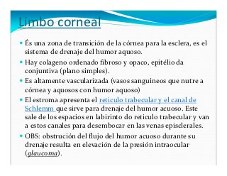 - 9. Limbo corneal És una zona de transición de la córnea para la esclera, es el sistema de drenaje del humor aquoso. Hay colageno ordenado fibroso y opaco, epitélio da conjuntiva (plano simples). Es altamente vascularizada (vasos sanguíneos que nutre a córnea y aquosos con humor aquoso) El estroma apresenta el reticulo trabecular y el canal de Schlemm que sirve para drenaje del humor acuoso. Este sale de los espacios en labirinto do reticulo trabecular y van a estos canales para desembocar en las venas episclerales. OBS: obstrución del flujo del humor acuoso durante su drenaje resulta en elevación de la presión intraocular (glaucoma).