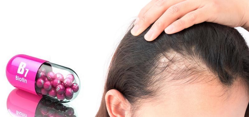 Los suplementos de biotina son a menudo recomendados como un producto natural para contrarrestar el problema de pérdida de cabello tanto en niños como adultos. Sin embargo, no hay estudios que muestren los beneficios de la biotina cuando el sujeto no está deficiente de la vitamina. Los signos y síntomas por deficiencia de biotina incluyen pérdida del cabello la cual progresa a severidad cuando incluye pérdida de pestañas y cejas. Algunos champús disponibles contienen biotina, pero es dudoso si estos ejercen algún efecto benéfico, ya que la biotina no es absorbida a través de la piel.