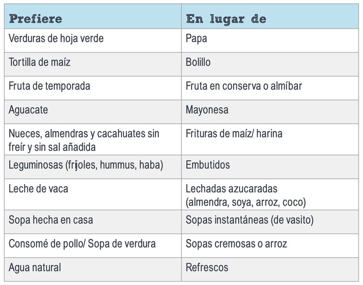 Idea saludable: Queso de canasto, panela, ricotta, cottage y requesón. Considera que el queso crema está clasificado por el Sistema Mexicano de Alimentos Equivalentes como grasa, no como queso. Una sustitución saludable (y deliciosa) puede ser el jocoque.