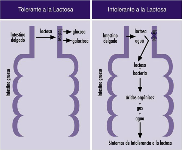 La intolerancia a la lactosa es una condición que afecta al 75 por ciento de la población hispana. Tener dificultad en tolerar la leche o los productos lácteos que contengan lactosa significa que se carece de la habilidad de digerir el azúcar que contiene la leche. La lactosa es un disacárido formado o compuesto por dos azúcares que se obtiene en los productos lácteos y es digerido en el intestino por la enzima lactasa. La función de la lactasa es romper la lactosa, convirtiéndola en glucosa y galactosa, dos azúcares sencillas que entran desde la pared intestinal al torrente sanguíneo para ser utilizados en los procesos metabólicos.