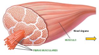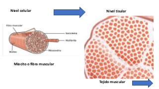 - 3. Nivel tisular Tejido muscular Nivel celular Miocito o fibra muscular
