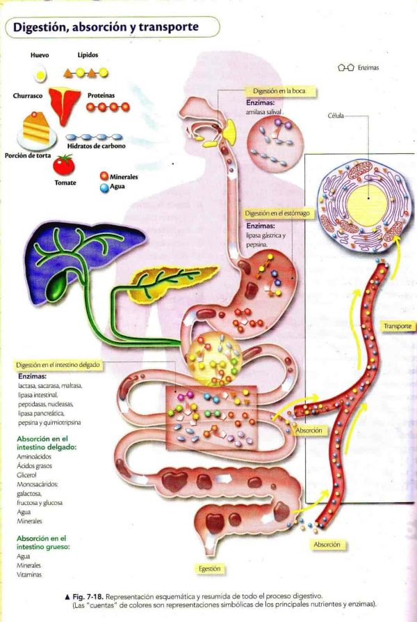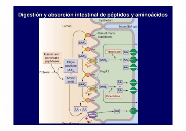 Llegados a este punto nos encontramos las proteínas digeridas en di y tripéptidos y aminoácidos libres que ahora si van a ser lo suficientemente pequeñas como para pasar a través de las membranas de las células del intestino (enterocito).