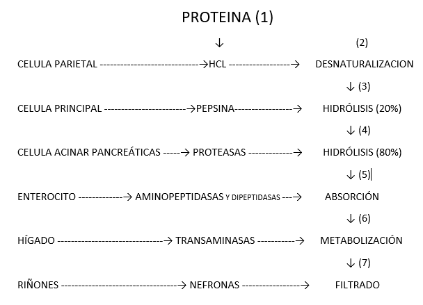 Después de varias horas de digestión en el estómago se forma el quimo, una masa ácida donde las proteínas ingeridas se han transformado en elementos más pequeños, que a través de los movimientos peristálticos del estómago van a pasar hacia el intestino de forma regular. El mismo intestino va a ser el encargado de estimular al páncreas en la secreción de enzimas proteolíticas terminando así la degradación total de las proteínas.