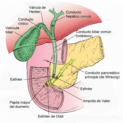 - Segregar iones HCO3- que neutralicen el quimo ácido evitando así una posible úlcera duodenal. Como vemos en la foto de la derecha, el duodeno está comunicado a con el páncreas y la vesícula biliar a través del conducto de Wirsung y colédoco que desembocan en el esfínter de Oddi.