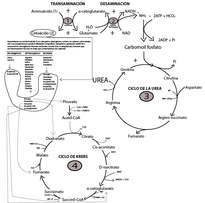 Como vemos en este proceso de desaminación se produce α-cetoglutarato y además NH3 (amoniaco), una sustancia sumamente toxica para nuestro organismo. El NH3 va a degradarse a urea a través del ciclo de la urea, una sustancia menos toxica que si puede viajar a través de la sangre para finalmente se excretada por los riñones.