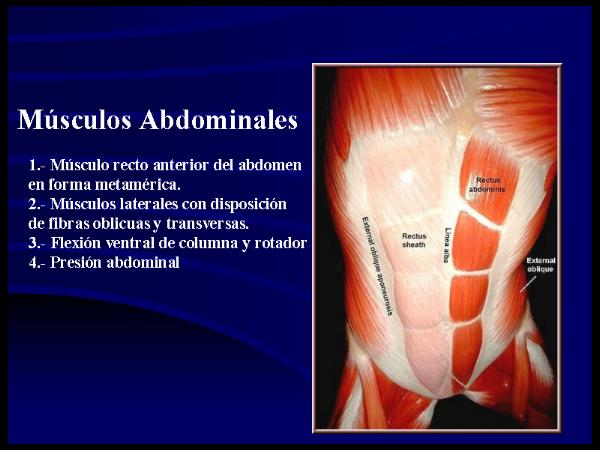 Los músculos del abdomen se distribuyen en tres grupos: anterior, lateral y posterior, que constituyen en gran parte las paredes abdominales, las cuales están recubiertas por la hoja parietal del peritoneo, cerrada superiormente por el diafragma e inferiormente limitada por la pelvis.