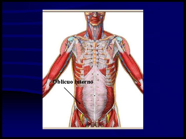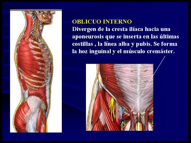Oblicuo interno, situado bajo el precedente, se extiende desde la región lumbar a las últimas costillas al pubis y a la línea alba. Está comprendido entre el latísimo y el transverso.