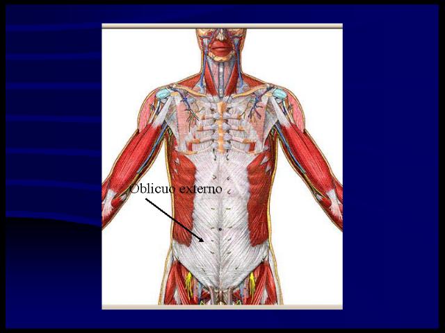 Oblicuo externo, superficial que en altura va desde la sexta costilla al pubis y en anchura del latísimo del dorso a la línea alba, cubre los otros músculos laterales del abdomen, las ocho últimas costillas y los músculos intercostales.