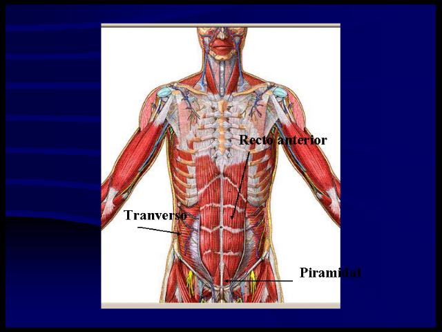 Recto anterior del abdomen, músculo en forma de cinta que va desde el pubis a las costillas medias, está cubierto por una vaina aponeurótica (vaina del recto anterior abdominal) que lo separa, por delante, de la piel, por detrás, de la fascia transversalis. Su borde medial está separado del lado opuesto por un rafe fibroso denominado linea alba. El borde lateral en las personas delgadas o musculosas crea una delimitación en la piel denominada línea semicircular.
