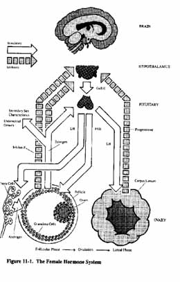 Para comenzar, debe recordarse que el cerebro es el centro regulador de toda la producción hormonal del cuerpo, y en particular del control de las hormonas que intervienen en el comportamiento sexual. La normal estimulación de los mecanismos cerebrales de la excitación sexual es, por tanto, activada a través de hormonas. El núcleo arcuato del hipotálamo segrega una sustancia llamada hormona liberadora de gonadotropinas (HLG), que se desplaza luego hasta el lóbulo frontal de la glándula pituitaria. Aquí se fabrican, continuamente durante toda la vida, una gran cantidad de hormonas. De ellas se destacan tres que están directamente vinculadas con la libido. La primera es la hormona luteinizante, que en los hombres va a los testículos y estimula a las células de Leydig para que produzcan testosterona. Un hombre sano produce unos siete miligramos de testosterona por día, cantidad que alcanza para mantener la virilidad y la potencia hormonal. En las mujeres, la hormona luteinizante va a los ovarios, suprarrenales, etcétera, en donde estimula, también, la producción de testosterona, sólo que en cantidades muy inferiores a las del hombre (0,3 miligramos diarios). La ciencia ignoró, durante mucho tiempo, para qué servía la testosterona en la mujer. "Hoy sabemos -aclara el Dr Michael Colgan en su libro La Salud Hormonal- que la testosterona es un importante estimulante del hipotálamo y de otras zonas del cerebro que activan tanto la libido de los hombres como de las mujeres".