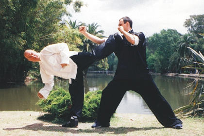 Sifu Sacomani realizando técnica de patada de la Escuela WuHsingChuan con el Sifu Natale